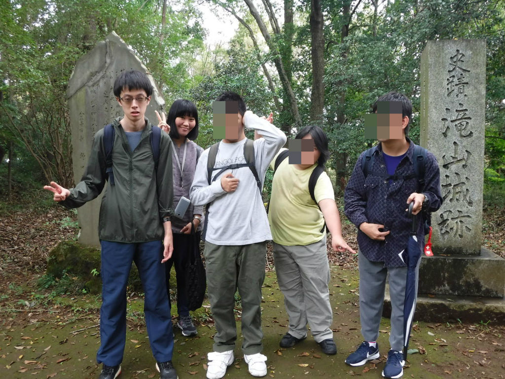 「滝山城址跡」の前で記念写真