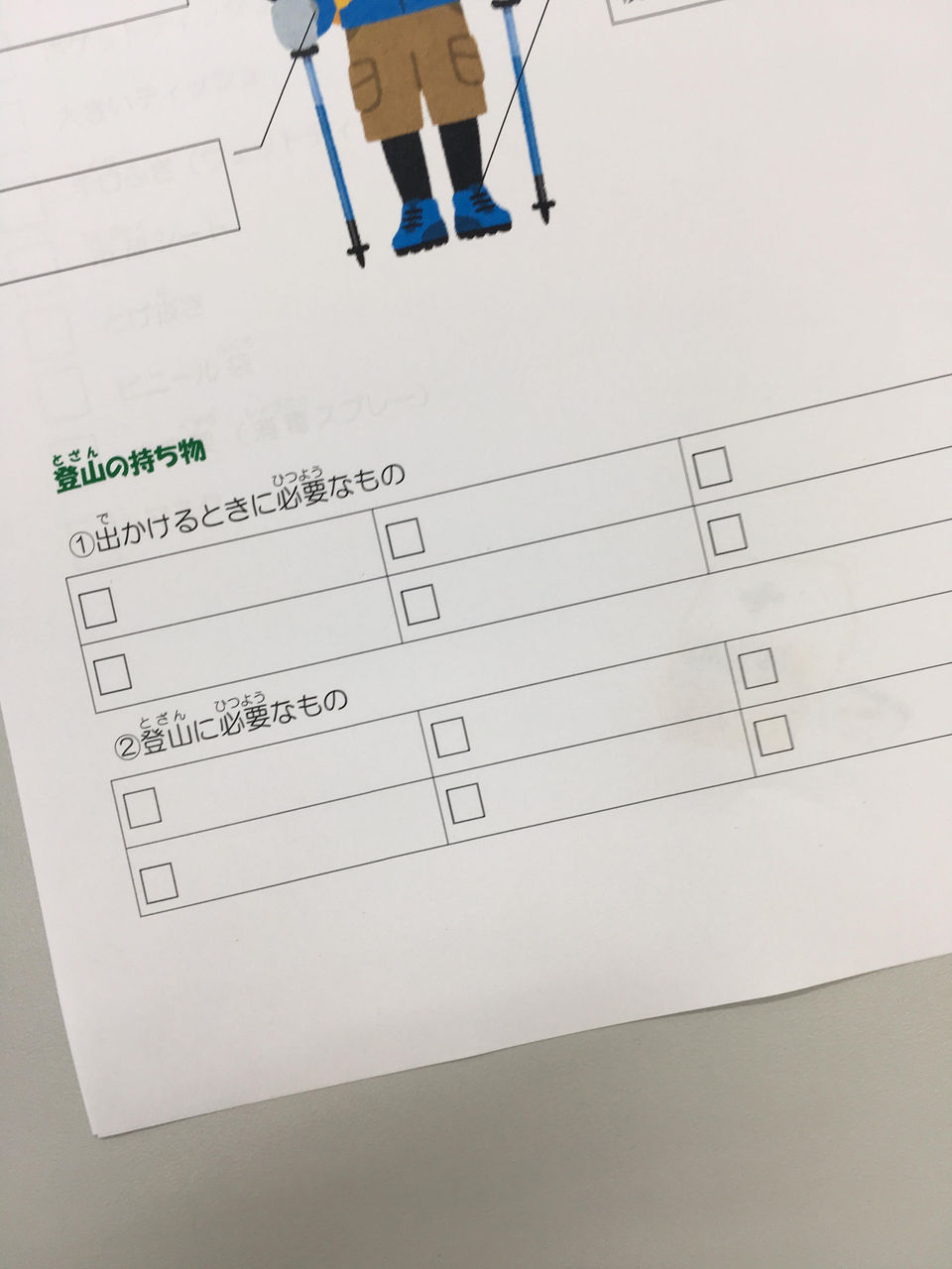 就労クラスということで、今回は宿題を出しました。持ち物を「出かけるときに必要なもの」と「登山に必要なもの」に分け、自分でチェックをしながら荷物を準備しようということを伝えました。