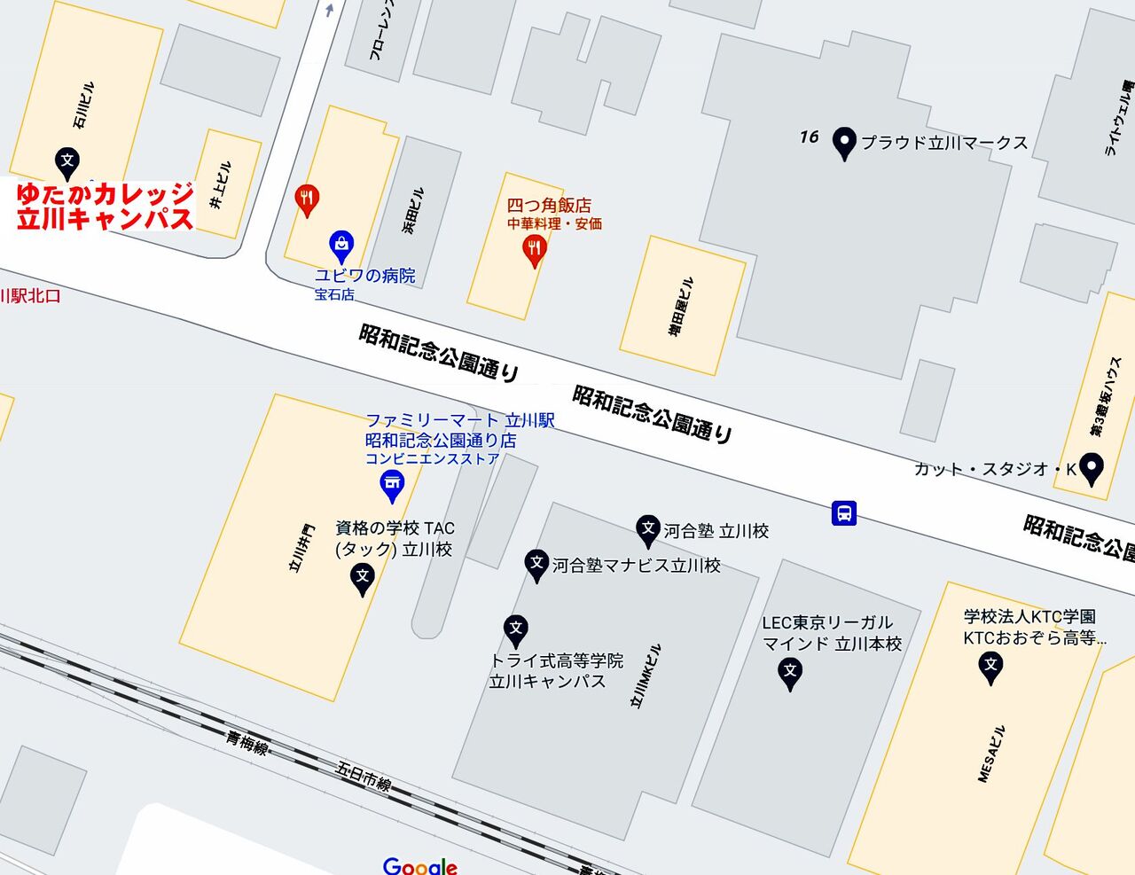立川キャンパスは、JR立川駅から徒歩5分に位置し、昭和記念公園通り沿いにあります。キャンパス周辺には、通信制高校、サポート校、予備校、各種学校など、学校関係が並ぶとても教育環境のよいところです。