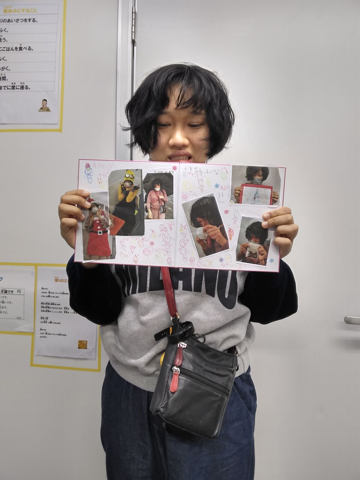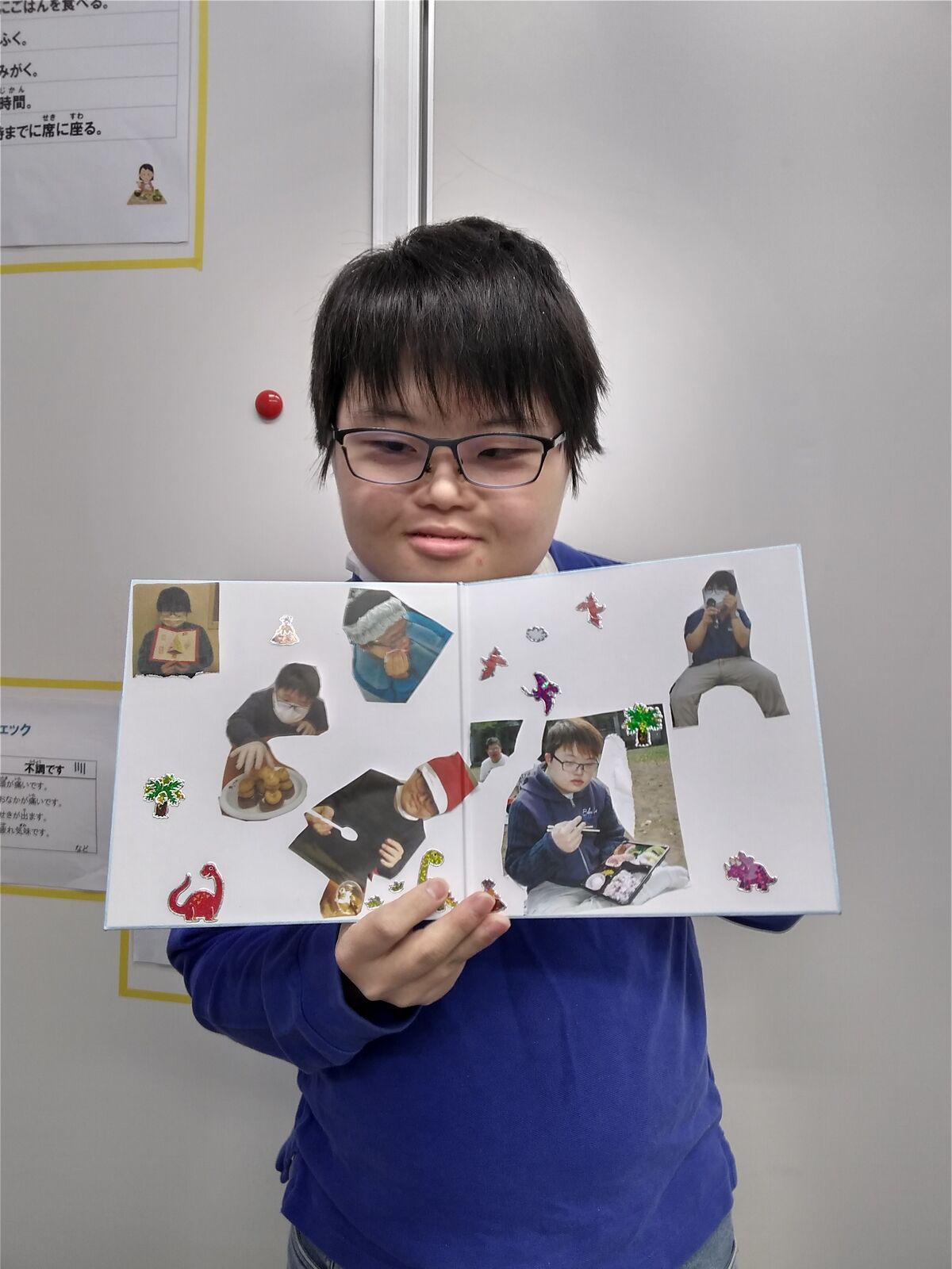 1年の思い出の写真から数枚をピックアップし、見開きの色紙にペタペタ!自分でコラージュをしてオリジナルの思い出アルバムを作りました。