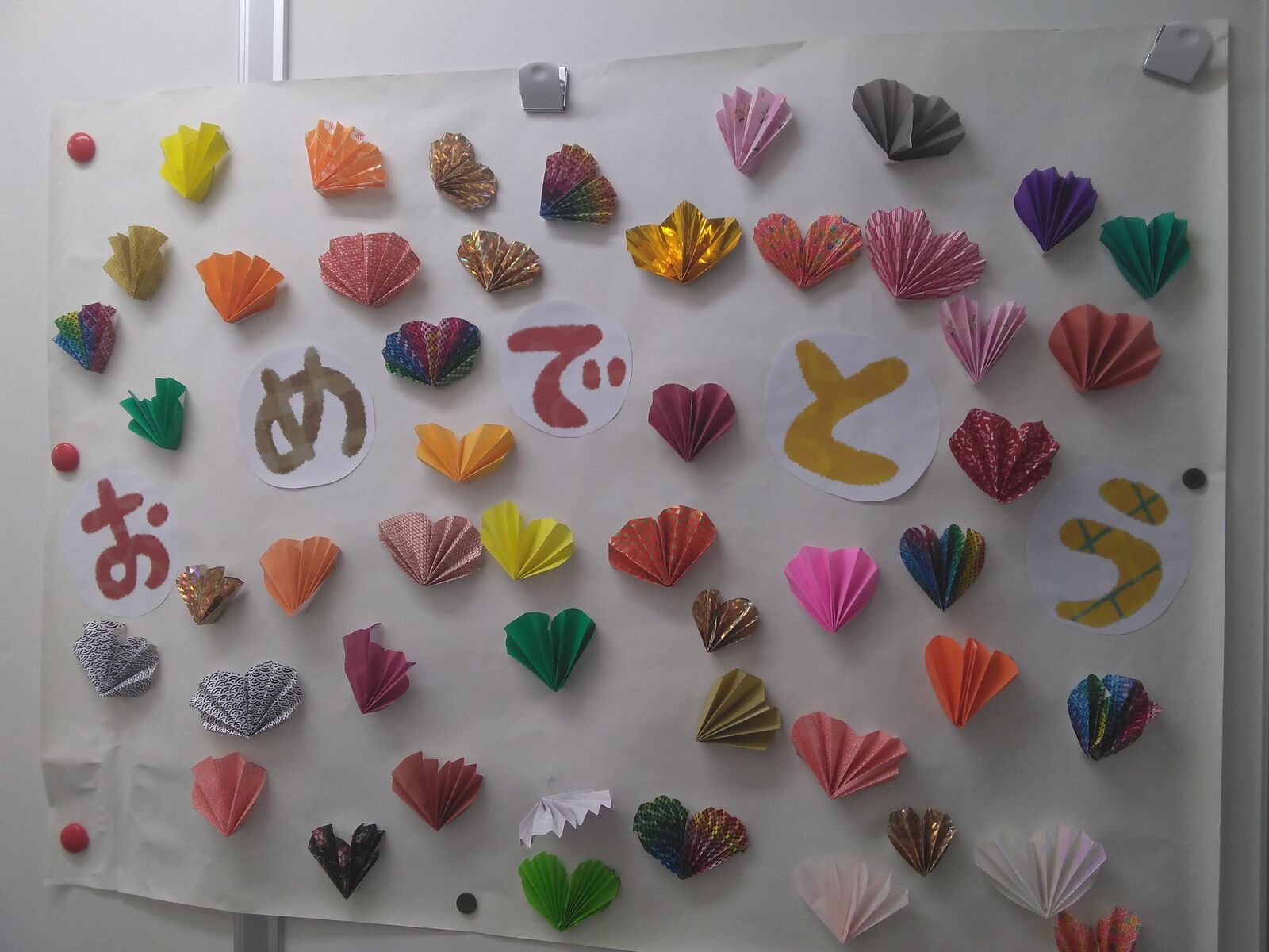 色とりどりの折り紙でハートを折り「卒業」「進級」それぞれの「おめでとう」をお祝いしました。
